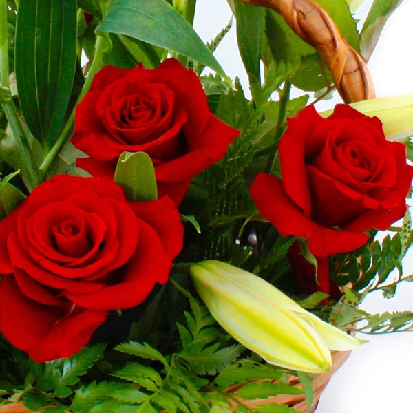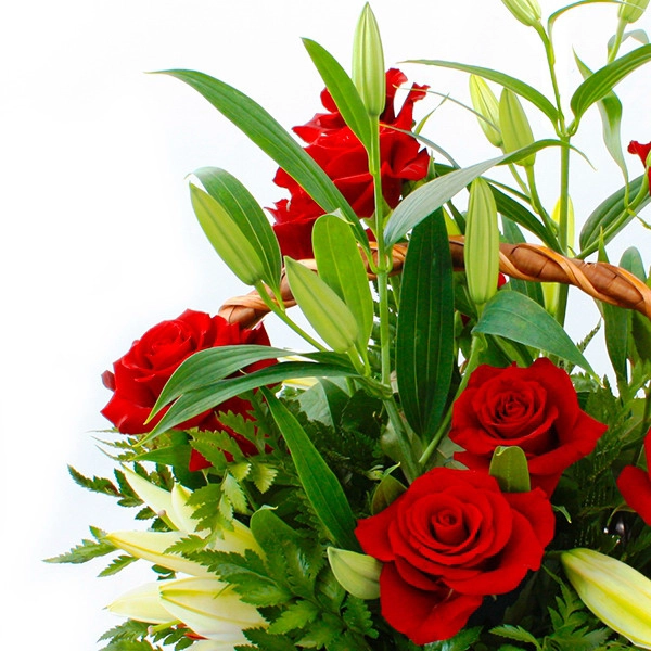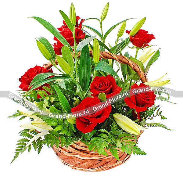 Прелестная корзинка ярко-красных роз в нежном обрамлении белых лилий напоминает красивую  историю любви , которая под покровом Вашей заботы останется  неизменно романтичной   и взаимной. Только в Ваших руках возможность подарить эти чувства любимой!