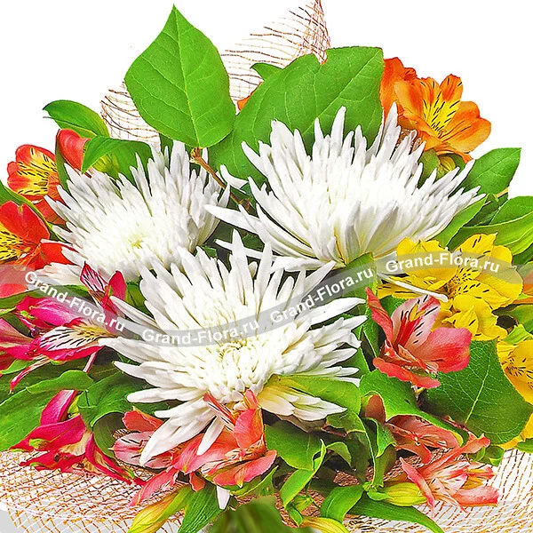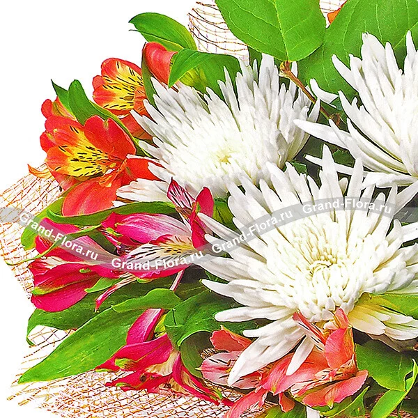 Стандартный: хризантема белая игольчатая - 5 шт., альстромерия желтая - 1 шт., альстромерия оранжевая - 1 шт., альстромерия розовая - 2 шт., альстромерия малиновая - 2 шт., декоративная зелень, сетка розовая.