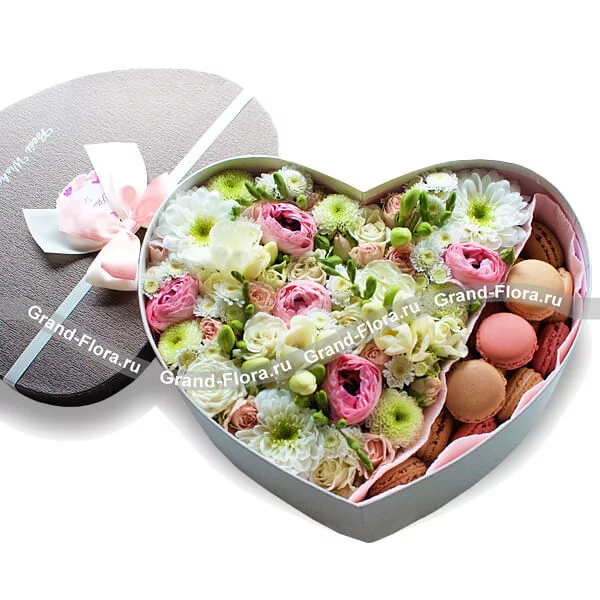 Стандартный (на фото): хризантема белая - 1 шт., хризантема белая (сантини) - 2 шт., фрезия белая - 4 шт., рунункулюс розовый - 5 шт., роза кустовая розовая - 1 шт., оазис, макарунс - 15 шт., коробка большая в виде сердца (30х30см).