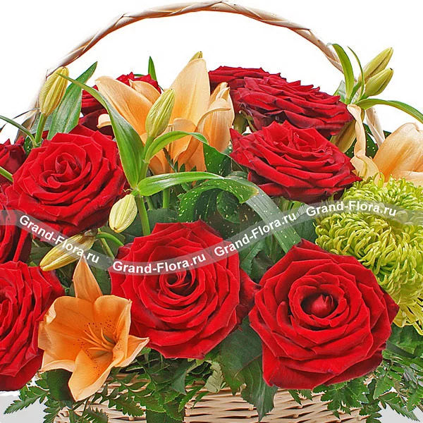 Уменьшенный: роза красная (50 см) - 5 шт., лилия желтая (по сезону. возможна замена на белую) - 1 шт., хризантема одноголовая зеленая - 2 шт., салал, папаратник - 4 шт., оазис, корзина.
